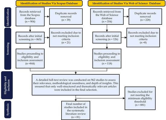 The initial search across Scopus and WoS retrieved a total of 1258 documents, with 904 from Scopus and 354 from WoS. Due to the overlap between these databases, which frequently index the same journals, conference proceedings, and publishers, duplicate entries were expected. Using bibliographic management tools, 267 duplicate items (21.2% of the total) were identified and removed, refining the dataset to 991 unique items for the screening phase. Specifically, 39 duplicates were found in Scopus, reducing its final count to 865, while WoS exhibited a higher redundancy, with 228 duplicates, leaving only 126 unique records. The substantial proportion of duplicates in WoS (64.4% of its initial records) suggests significant content overlap with Scopus, reinforcing the necessity of cross-checking sources in systematic reviews.