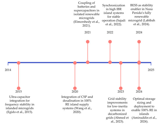 Energy storage is widely recognized as a crucial facilitator of high renewable energy penetration in island systems [70,71]. This thematic area explores different storage solutions, including BESSs, hydrogen storage, PHS, and flywheels. The reviewed articles discuss how these technologies help mitigate the intermittency of renewable generation, improve grid reliability, and provide frequency and voltage support. Particular emphasis is placed on optimizing storage capacity, extending battery lifespan, and implementing hybrid storage solutions to balance cost and performance [62]. Additionally, studies examine emerging trends in long-duration storage and their potential role in achieving 100% renewable energy systems in islands [44].