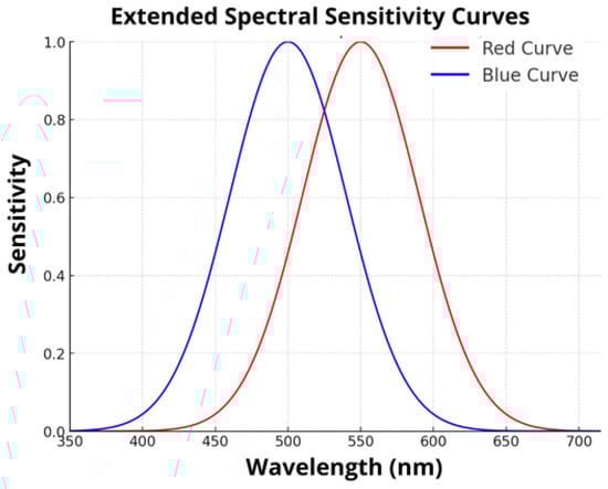 According to [52], approximately 50% of the solar radiation that reaches the Earth’s surface is composed of visible light, which falls within the 400–700 nm range. Photometers are used to measure light as perceived by the human eye. They are calibrated according to the standards established by the International Commission on Illumination (CIE), as shown in Figure 1.