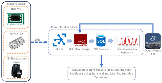 In order to evaluate the capability of low-cost ambient light sensors to estimate solar radiation compared to professional solar radiation sensors and investigate the potential limitations of photometers in measuring solar radiation, the architecture depicted in Figure 2 is proposed.