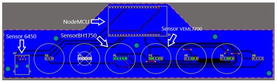 The PCB design presented in Figure 4 was specifically developed to integrate the NodeMCU ESP32 microcontroller with the 6450 solar radiation sensor, as well as the BH1750 ambient light sensor and the VEML7700 ambient light sensor. The layout was designed to position the sensors near one another, ensuring that they were all exposed to the same physical stimuli under uniform environmental conditions, such as light intensity or solar radiation. The sensors were mounted at the same height, separating 30 cm between the sensors and the mounting connector of the 6450 sensor.