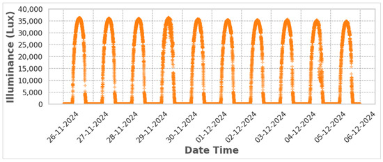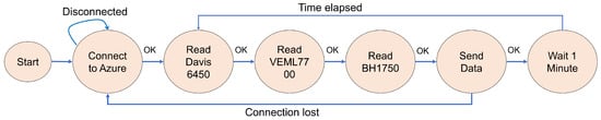 The processed irradiance data were then transmitted to the Azure cloud services for further storage and analysis. Measurements were conducted simultaneously with the BH1750 and VEML7700 sensors, creating a comprehensive dataset for subsequent performance evaluation and comparative analysis.