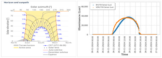 In this way, the VEML7700 was tested by comparing its measured values against those from a calibrated optometer, indicating close agreement for illumination levels of up to approximately 1000 lx. In these modes, the sensor’s output remained linear; however, at higher illumination levels, non-linearities were introduced, which could be managed by applying a factory-provided polynomial correction [57]. Consequently, we considered the VEML7700 a responsible reference for calibrating and validating the performance of the BH1750 sensor manufactured by ROHM Semiconductor, located in Kyoto, Japan.