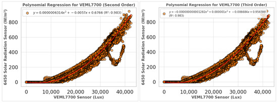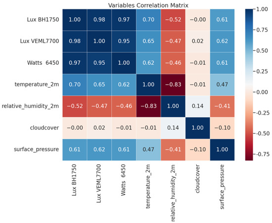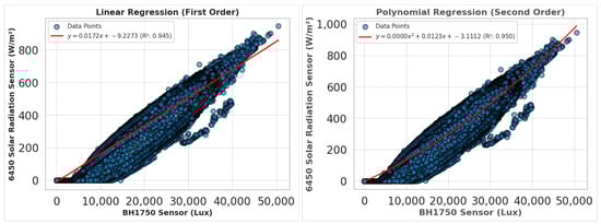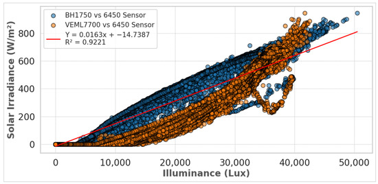 In this study, the Davis Instruments 6450 solar radiation sensor was used as a reference to evaluate the performance of low-cost light sensors, such as the BH1750 and VEML7700, in estimating solar irradiance. The 6450 sensor provided a stable foundation for analyzing the correlation between lux-based measurements and irradiance values. The sensor was integrated into the sensor board and communicated via an analog interface, where its voltage readings (measured in millivolts) were converted into irradiance values (in W/m2) using the conversion factor specified in the manufacturer’s datasheet [52].