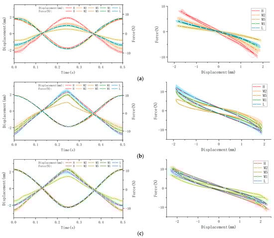 The processed data are presented through force–time and displacement–time curves, clearly illustrating the mechanical response of plantar soft tissue under dynamic cyclic loading conditions. Since the applied displacement remains constant within each testing mode, variations in force magnitude directly reflect differences in the tissue’s elastic modulus; a higher force magnitude corresponds to increased stiffness. Furthermore, the viscoelastic properties of the plantar soft tissue are distinctly revealed by the characteristic hysteresis loops obtained from the force–displacement curves. The area enclosed by each hysteresis loop, determined by the phase difference between the applied displacement and the resultant force, quantifies the energy dissipated (ΔW) per loading cycle. A larger hysteresis loop area indicates greater energy dissipation and thus higher tissue viscosity, which significantly influences the damping and shock-absorption capabilities of the tissue. Conversely, a smaller hysteresis area indicates lower viscosity and reduced energy loss.