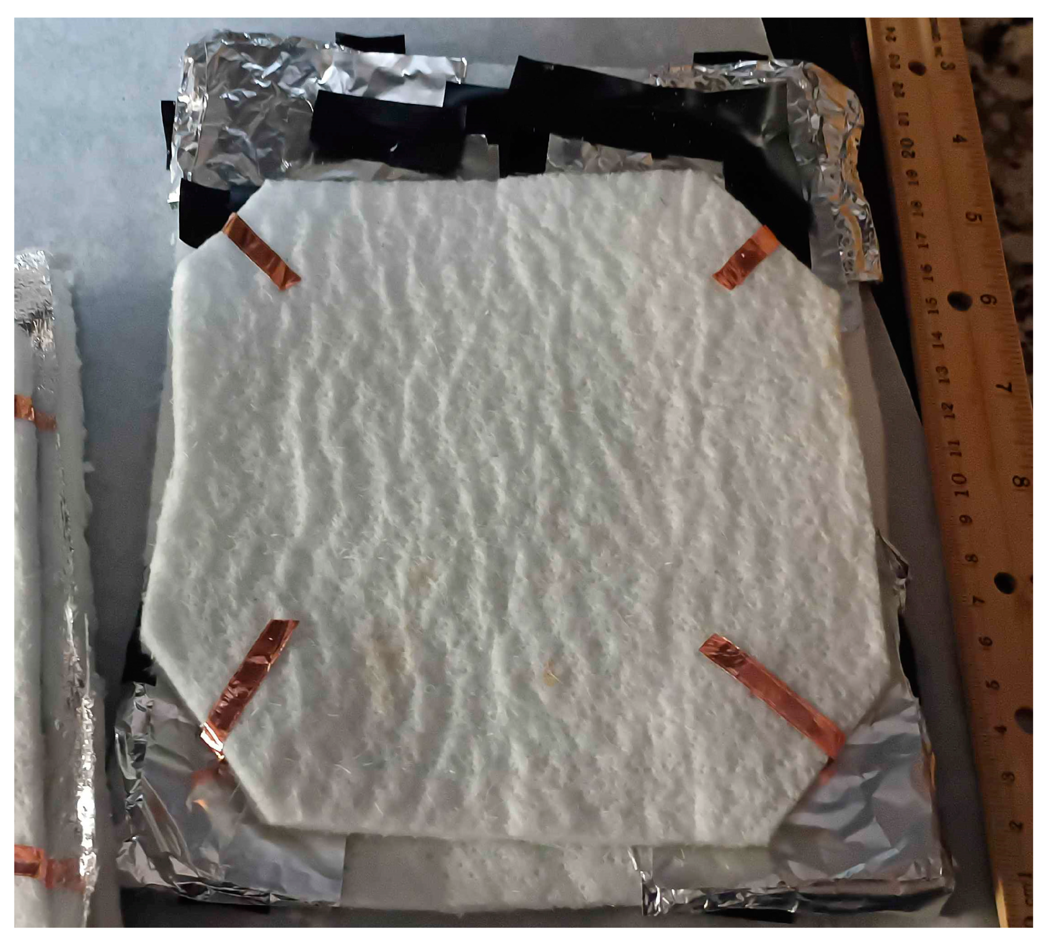 Aerogel foam was purchased from Ningyan Benuo Technology Company (Yongzhou City, Hunan, China). The 1 cm thick silica aerogel insulation was cut into 18 cm squares, each weighing approximately 19.6 ± 2.5 g. Eight samples were prepared, half with cornstarch (Argo, Westchester, IL, USA) baked into them. Using prior recipes for oobleck, a total of 17 g of cornstarch was hand mixed in 12 mL of room-temperature deionized water for 2 min [1,2,24,25,26]. Each square of aerogel foam was thoroughly soaked in 4 L of deionized water. Half of the samples were coated on both sides with the cornstarch–water mixture. To dry them, the samples were baked in an oven at 76 °C for 90 min.