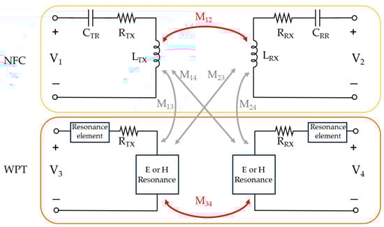 Figure 3 illustrates the link structure of the four-port coupler combining NFC and WPT. The WPT system can be implemented using either IPT or CPT and follows the MIMO WPT link principle [23]. In the NFC coupler, V1 and V3 represent the source voltages of NFC and WPT, respectively, while V2 and V4 correspond to the load voltages.