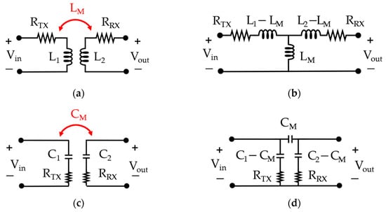 The structure of the PEC matrix varies depending on the coupling field and the matching circuit configuration of the coupler. In this study, the PEC matrix is classified into two types. Since IPT operates via magnetic coupling, the equivalent circuit of Figure 4a can be transformed into a T-model, as shown in Figure 4b, incorporating mutual terms. Meanwhile, the four-plate CPT coupler utilizes electric field coupling, and its equivalent circuit can be transformed from the structure in Figure 4c into a pi-model, as illustrated in Figure 4d. Additionally, all PEC models incorporate coupler loss resistance to ensure high accuracy in comparison with simulation results.
