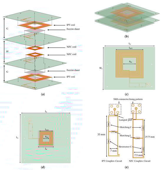 Figure 7a illustrates the coupling structure of the NFC–IPT coupler, where each component is shown separately for clarity. The model replicates a configuration in which coil structures are printed on one side of four substrates. The NFC coupler is stacked between IPT couplers, which are also arranged in a stacked structure. Ferrite material is applied to minimize interference caused by the magnetic field of the coils.
