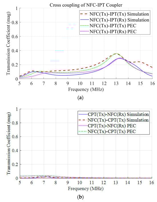 Figure 10 presents the transmission characteristics of cross-coupling components in NFC–IPT and NFC–CPT couplers. Figure 10a illustrates the coupling between the NFC transmitter and the IPT receiver, as well as between the NFC transmitter and the IPT transmitter. In the 6–7 MHz range, the transmission coefficient for the coupling between the NFC transmitter and the IPT receiver reached a maximum of 0.1 in the simulation and 0.07 in the PEC analysis. Additionally, harmonic components were observed in the cross-coupling. Since 13.56 MHz is an integer multiple of 6.78 MHz, coupling increases when the resonance conditions overlap. Because both NFC and IPT couplers transfer power through inductive coupling, the extent of cross-coupling was significantly high. In contrast, for the NFC–CPT coupler, the transmission coefficient for cross-coupling had a maximum value of 0.03 in the PEC analysis, which is negligible.