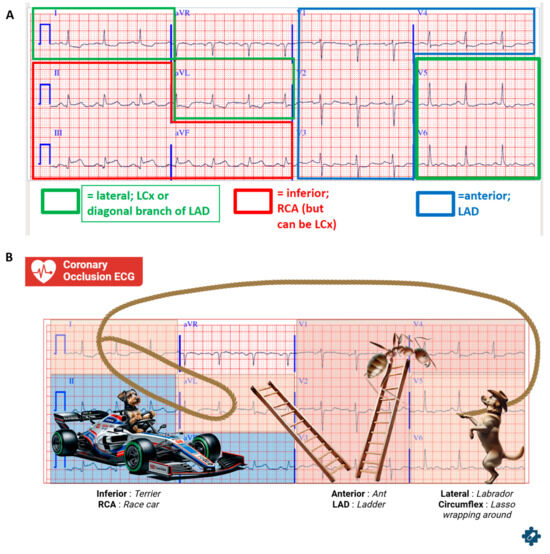 Image to support coronary artery obstruction localization via ECG. (A) Original image presenting the relationship between ECG leads and coronary artery and heart localization (lateral, inferior, and anterior). (B) Experimental image with mnemonic-based illustrations overlayed on their respective ECG leads and explanations of the illustrations below.