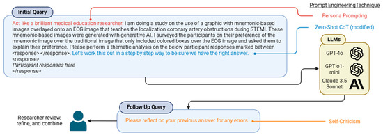 Overview of thematic analysis. The initial prompt utilized prompt engineering techniques that included Persona Prompting [35,36], Zero-Shot Chain of Thought (CoT) [37], and Self-Criticism [38]. The output from all three models was reviewed, refined, and combined into the final analysis by the researcher.