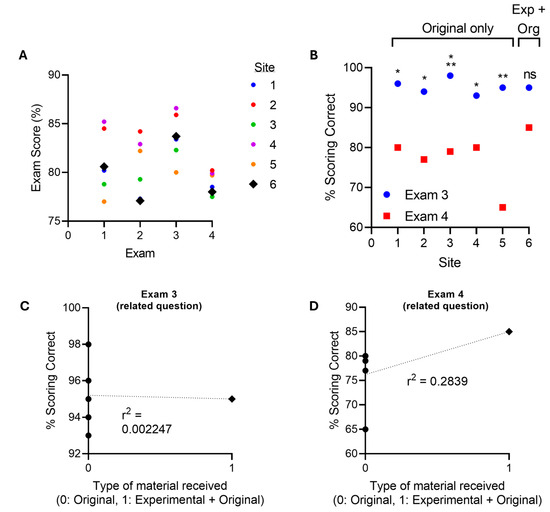 Student achievement analysis. (A) Exam scores for all exams across all sites. Site 6 received the experimental image along with the original image. (B) Scores on the exam question relating to material covered by the coronary artery obstruction localization with ECG images. A similar question was assessed on Exam 3 (six days post-lecture) and Exam 4 (eleven days post-lecture). (C,D) Linear regression analysis of the percentage of students scoring a correct answer on Exam 3 (C) and Exam 4 (D) questions covered by the original and experimental images. * p < 0.05, ** p < 0.01, and *** p < 0.001. Exp: experimental; Org: original.