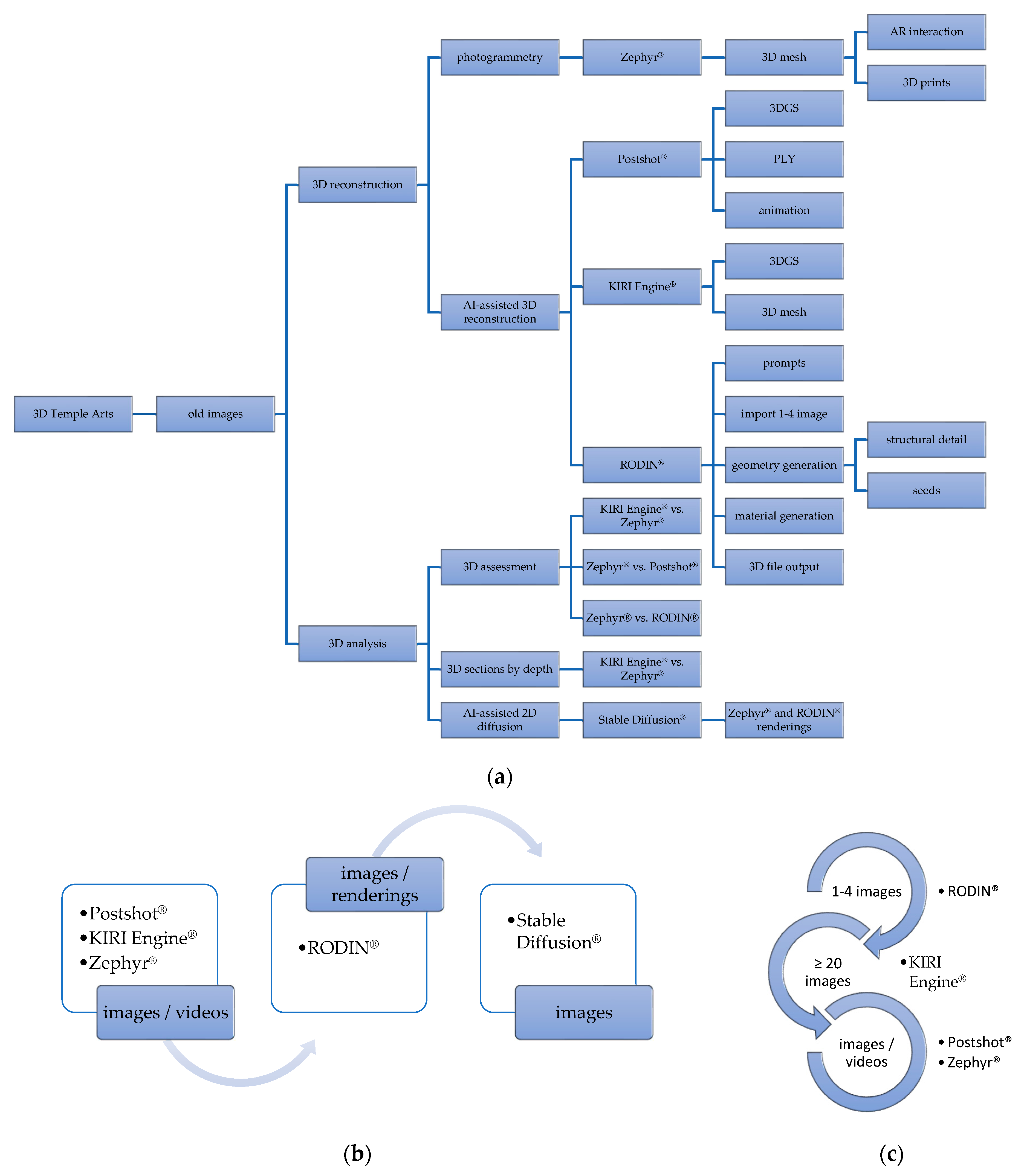 AI-assisted 3D model reconstruction verifies details corresponding to different 3D platforms. The point cloud and mesh created using Zephyr® were referred to and compared with those of the 3DGS and polygon models generated using Postshot®, RODIN®, and KIRI Engine® under the following requirements: