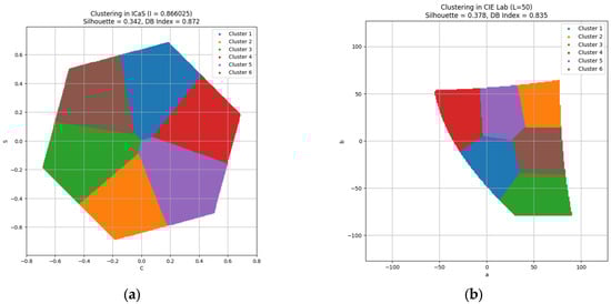 | Clustering Metrics | CaS-Plane of Constant Brightness (I = 0.866) in ICaS Color Space | a*b*-Plane of Constant Brightness (L = 53.77) in CIE L*a*b* Color Space |