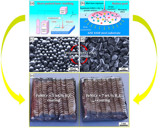 - Okulov, A.; Korobov, Y.; Stepchenkov, A.; Makarov, A.; Iusupova, O.; Korkh, Y.; Kuznetsova, T.; Kharanzhevskiy, E.; Liu, K. Mechanical and structural characterization of laser-cladded medium-entropy FeNiCr-B4C coatings. Materials 2023, 16, 5479. [Google Scholar] [CrossRef] [PubMed]