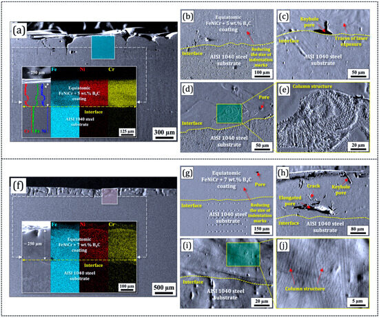 - The FeNiCr-B4C (5 and 7 wt.% B4C) cross-sections are characterized by an average thickness of 250 ± 20 μm and a transition zone of 80 ± 10 μm. Both coatings possess a homogeneous surface texture with a typical column structure and rare defects, such as elongated and keyhole pores, as well as cracks.