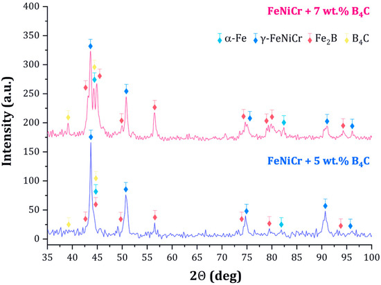 - The XRD analysis confirmed that both FeNiCr-B4C (5 and 7 wt.% B4C) coatings consist of the following phases: α-Fe, space group Im-3m; γ-FeNiCr, space group Fm-3m; Fe2B, space group I-42m; and B4C, space group R-3m.