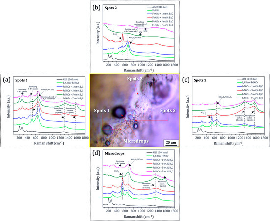 - Raman spectroscopy also revealed the presence of B4C phases inside the FeNiCr + 5 wt.% B4C and FeNiCr + 7 wt.% B4C coatings through detected peaks corresponding to amorphous carbon, stretching C-B-C chains in B4C and vibrational modes of B11C icosahedra. The additional peaks related to intraicosahedral B-B bonds, rotating mode of the C-B-C chain in B4C, and breathing vibrations of B11C icosahedra were identified for both presented coatings. This was an extra indicator of the B4C presence.