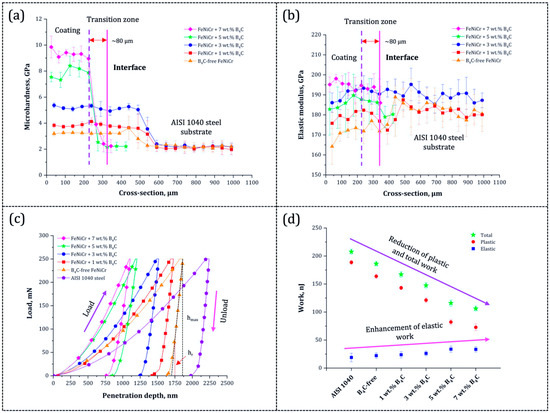 - In situ reinforcement with 5 and 7 wt.% B4C significantly increased microhardness, showing enhancements up to 201% compared to the B4C-free FeNiCr coating, and up to 351% relative to the AISI 1040 steel substrate, respectively. This was promoted by the synergistic strengthening effect between the in situ formed Fe2B and the retained B4C phases.