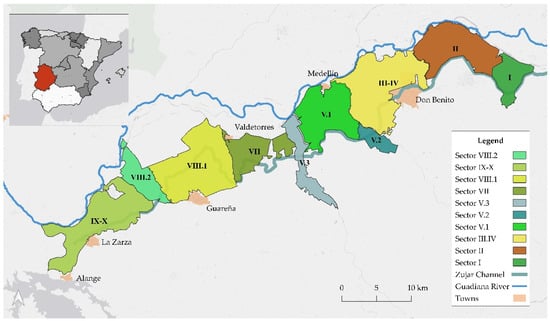 The data necessary for the development of this study were obtained from the Canal del Zújar Irrigation District (CZID), located in Extremadura (Spain). The irrigated area extends along the left bank of the Zújar River to its mouth in the Guadiana River, covering an area of 20,870 ha. The area is divided into 10 pressurised irrigation sectors, Figure 1.