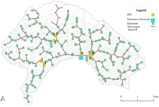 Using data of real water consumption in Sector II, it is possible to determine the hourly flow rate through each pipe in the network and the hourly volume pumped throughout the district, enabling the possibility to hydraulically assess the behaviour of the network and analyse the excess pressure available through an EPANET hydraulic model of the network []. This irrigation sector has already been the subject of previous studies, such as the research developed by Crespo Chacón et al. [], who validated a methodology for determining flow rates in irrigation networks on demand using real flow data records.