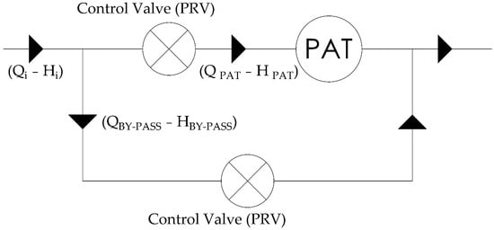 To guarantee the required operating conditions downstream flow demand of an EPP while optimising ER, the method employed by Lydon et al. [,] was adopted. A bypass configuration was proposed for the installation of a PAT, shown in Figure 3, comprising two control valves (pressure reducing valve (PRV), flow control valve (FCV), or similar), one in series with the PAT and one in parallel, to ensure that the desired downstream demands are fulfilled with the required conditions in terms of pressure and flow.