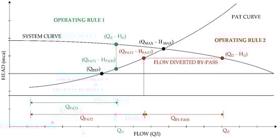 Representation of a potential PAT flow-head curve for a hypothetical site, and working pairs () for a random flow greater than the maximum in the Q–H space for two operating rules fixed, Operating rule1 (green colour) and Operating rule 2 (red colour). Source: own elaboration adapted from [].