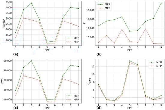 To compare the results of the two objective functions, the ER and PP values associated with the two operating points of each EPP listed in Table 2 are shown in Figure 6: the values of the annual savings in euros, Figure 6a; the investment required to carry out the designed installation, Figure 6b; the energy recovered for each objective function, Figure 6c; and the payback period was calculated for this function to compare it with the results of both objective functions, Figure 6d. The variation in energy recovered between the objective function MER and MPP ranges from 1597.57 kWh to 18,394.05 kWh per year. The variation in PPs between both functions ranges from 0.14 to 0.7 years.