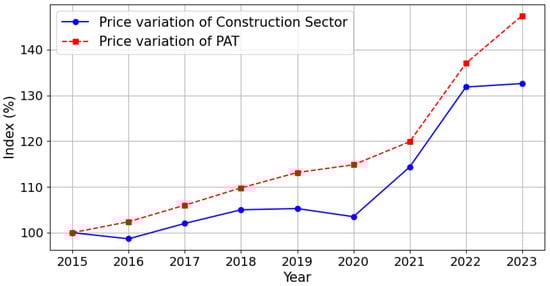 Variation of Construction Index of the construction sector and index of the PAT (2015–2023). Source: own research.