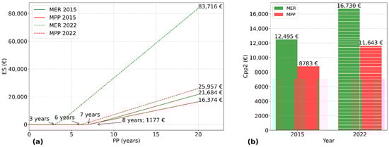Conversely, a reverse trend in energy prices, returning them to values similar to those of 2015, combined with a decrease in installation costs, would make the MPP criterion more favourable. In this scenario, the difference in PP, shown in Figure 8a, narrows to similar values between 7 and 8 years, while the difference in ES to just over EUR 5000 (EUR 21,684 vs. EUR 16,374) between functions after 20 years. The difference in between both functions in 2015 is EUR 3712.00 (see Figure 8b). Taking costs into account, the final benefit would be around EUR 1598.00. This further reduces the relative advantage of MER, particularly when accounting for inflation and equipment depreciation. Under these conditions, the break-even point between the two options is reached in year 8, with net savings of only EUR 1177. This makes it difficult to justify the higher investment required for MER.