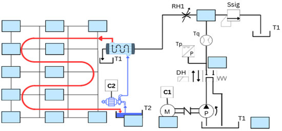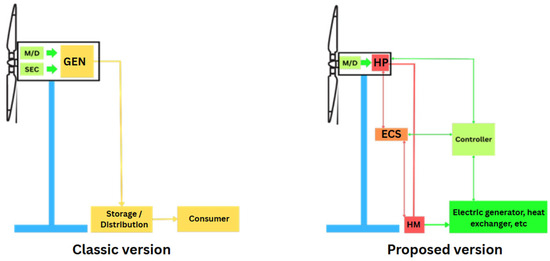 Following the initial testing phase of the system, the results confirmed the anticipated outcome: the hydraulic oil effectively facilitated the conversion of mechanical energy, supplied by the electric motor, into thermal energy. This conversion process validated the fundamental thermodynamic principles underpinning the system’s design. Subsequent research efforts will focus on the integration of realistic wind speed profiles and corresponding power outputs, emulating the dynamic behavior of the motor shaft under variable operational conditions. Furthermore, the thermal energy generated will be transferred to secondary systems, such as underfloor heating installations or other non-critical energy consumers, which could benefit from this method of energy repurposing. The objective is to enhance the overall efficiency and utility of the system by capturing otherwise wasted mechanical energy and redirecting it toward sustainable and practical applications. A schematic of a possible setup of such a system is shown in Figure 15. Further work will also be undertaken to improve or simulate certain scenarios regarding the type of turbine used, relying on work performed by other scientists [34]. In addition, research is currently being conducted to allow for thermal storage for mid-to-long term use of the energy generated. Furthermore, the system might stand to benefit from using proportional throttle valves, allowing for wind speed compensation for more complex scenarios.