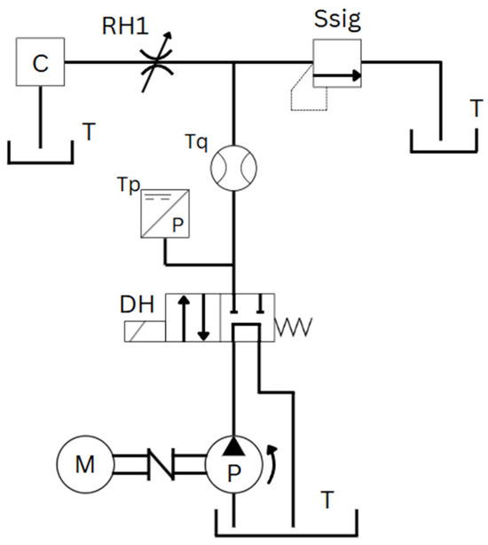 Downstream of the DH valve, the system is instrumented with a pressure transducer (Tp) and a flow rate sensor (Tq), which continuously monitor the real-time hydraulic parameters. These measurements are crucial for characterizing the performance of the system and validating simulation models. Additionally, a safety relief valve, labeled Ssig, is incorporated into the circuit to provide overpressure protection. This valve is factory-calibrated to open at a pressure slightly above the system’s nominal operating range, thereby mitigating the risk of structural damage or component failure due to hydraulic overloading.