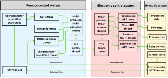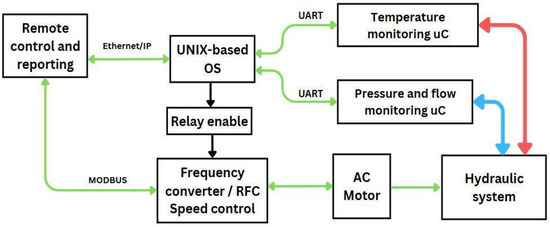 A redundant control mechanism is implemented by routing the enable signal for the frequency converter through an independent Ethernet-based communication channel managed at the SBC level. This allows for an automatic shutdown of the pump if communication via Modbus to the remote user is lost or if critical system parameters (flow, temperature, pressure) exceed predefined thresholds. These were set at 70 °C for the hydraulic oil, 55 bar pressure, as well as 15 L per minute. The general schematic of the system control is presented in Figure 3. Green arrows represent data signals, while red and blue arrows represent pressure and flow information. Arrow directions show if communication is either unidirectional or bidirectional.
