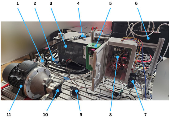 Following the initial system dimensioning and design phase, the physical assembly of the components was carried out. The completed assembly is depicted in Figure 4, which provides a comprehensive overview of the entire system configuration. The labeled components include the directional control valve and pressure sensor (1), the flow sensor (2), the tank (3), and the throttle valve (4). The motor (11) and the pump (10) are regulated by a frequency controller (5) and the control circuit (8), both of which are powered by an AC-to-DC power supply (7). Additionally, a webcam (9) is integrated into the system to enable remote monitoring. Where needed, fused deposition modeling was used to create supports for the equipment used, using settings as specified in [33].