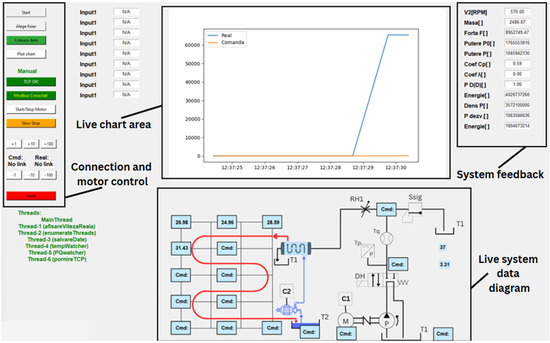 Due to the inherent complexity and concurrency requirements of the test stand—particularly with regard to synchronizing sensor input, motor control, and data logging operations—a multi-threaded programming model was adopted. This approach enabled parallel execution of critical tasks, ensuring responsive system behavior and stable performance under varying operational loads. The overall software structure and thread management strategy are illustrated schematically in Figure 5.