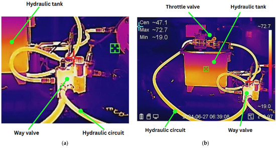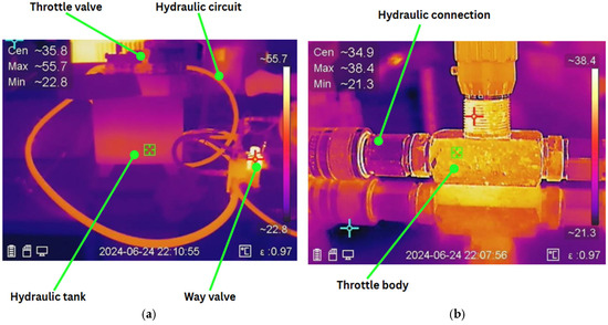 After initial functionality tests of the installation, hydraulic oil was added, and a pressure of 10 bar was generated in the system by using the throttle valve. With the aid of a thermal camera, FLIR E54 24° produced by the company Teledyne FLIR LLC in Estonia, city of Tallinn, we could already observe a small temperature increase of approximately 10 °C over a period of 30 min. This result can be observed in Figure 7 and Figure 8, as captured using a thermal camera. Belco ISO VG 46 oil was used. The oil was provided by the company branch office, the city of Suceava, Romania. It has a kinematic viscosity of 41.4–50.6 cSt at 40 °C, per ISO 3448. Its viscosity index typically ranges from 95 to 105 for mineral oils and higher (120+) for synthetics, ensuring stable viscosity across temperatures. The flash point is generally above 200 °C, and the pour point ranges from −30 °C to −40 °C. Regarding the sensors used, for pressure, a QDW90A sensor produced by Anhui Qidian Automation Technology Co., Ltd., located in the city of Huaibei, China was used. It is a high-precision stainless steel pressure sensor designed for industrial applications. It offers customizable output signals (4–20 mA, 0–10 V, RS485), measures pressures from −0.1 MPa to 60 MPa, and operates in temperatures from −20 °C to 400 °C. The GTLWGY turbine flow meter produced by Anhui Jujie Automation Technology Co., Ltd., located in the city of Wuhu, China, is a precision instrument used to measure liquid flow rates. It operates by detecting the rotational speed of a turbine within the flow stream. Working parameters include flow ranges from 0.1 to 2000 m3/h, pressure up to 25 MPa, and temperatures from −20 °C to 120 °C.