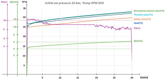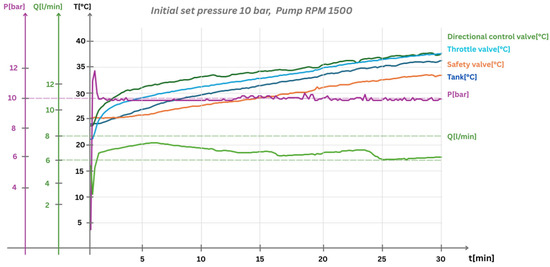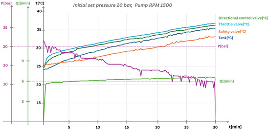 Over the course of a 30 min operating period, the system exhibited a noticeable thermal response, with the temperature of the working fluid rising by approximately 15 °C. In addition to the thermal effects, a smaller reduction in system pressure was observed relative to earlier tests, accompanied by a modest decrease in the oil flow rate toward the end of the interval. This specific behavior—characterized by elevated temperature, slightly diminished flow, and reduced pressure—was found to occur predominantly under conditions of low pressure (10 bar) in combination with high pump speed (1500 RPM). The observed performance was attributed to intrinsic operational characteristics of the pump, such as internal leakage, efficiency limitations, or temperature-dependent viscosity effects at elevated speeds, which become especially relevant when examining the system’s behavior at different pressure levels with a fixed throttle valve as the only load. At 10 bar, the system operates stably even as oil temperature rises, because the flow demand through the throttle is relatively low and the pump’s internal leakage remains within manageable limits. Although viscosity decreases with rising temperature—slightly increasing the internal slip—the gear pump can still easily maintain the required flow and pressure. This pressure stability is further supported by the fact that flow through a fixed orifice depends on the square root of the pressure drop, allowing the pump to supply sufficient flow to meet demand despite temperature-related changes.