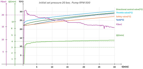 Additional experimental testing procedures were systematically carried out at an intermediate pressure level of 20 bar to further investigate the system’s performance characteristics. Testing was conducted under two distinct operational conditions: first, at the minimum specified pump rotational speed of 500 rotations per minute (RPM), and second, at the maximum operational speed of 1500 RPM. The primary objective of these tests was to thoroughly evaluate and characterize both the thermal response and flow behavior of the hydraulic system while operating at this mid-range pressure setting. Particular attention was given to identifying any nonlinearities, transitional flow phenomena, or thermal instabilities arising under different dynamic load conditions.