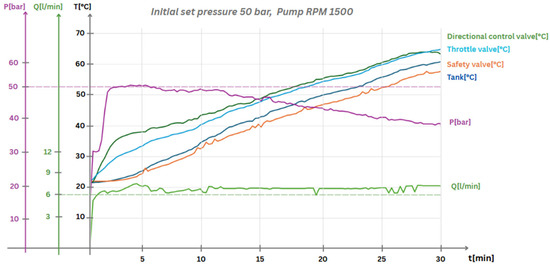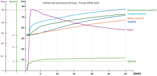 Finally, a series of tests was carried out at a significantly higher initial pressure setting of 50 bar, under two distinct operating conditions corresponding to pump speeds of 500 and 1500 rotations per minute. The results are shown in Figure 13 and Figure 14. Under these conditions, a substantially greater thermal gradient was recorded when compared to previous trials. Specifically, at the lower pump speed of 500 RPM, the working fluid exhibited a temperature increase of approximately 15 °C over the standard test duration of 30 min. In contrast, at the higher speed of 1500 RPM, the temperature rise was markedly more pronounced, reaching approximately 43 °C within the same timeframe.