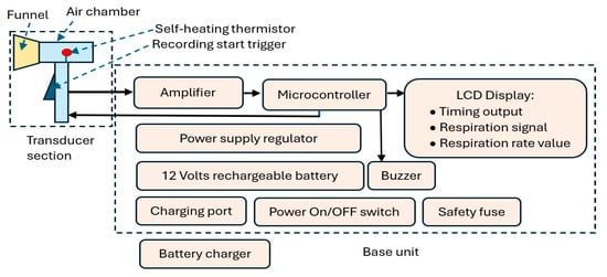 - Section B: This is the device’s base unit that is connected by a wire to the transducer section (i.e., Section A). It receives the electrical signal from section A and processes it using a microcontroller. The microcontroller communicates with the RR measurement-start trigger mechanism, sends information to an LCD to indicate the recording time (this is count down of time in seconds from the time the trigger is pressed to the final measurement), displays respiratory signal, and shows the value of the RR when measurement is completed. The microcontroller also activates a buzzer indicating RR value is ready to read from the LCD. The base unit contains power supply regulators and a 12 V rechargeable battery. It has ports to connect it to its battery charger. The unit has a power switch ON/OFF button and a safety fuse.