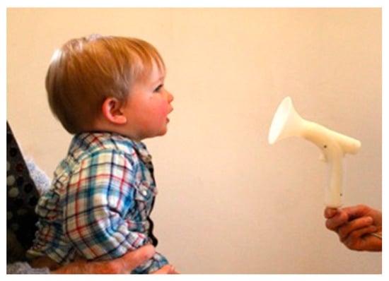 To measure RR, the operator positioned the funnel of the transducer section toward the participant’s face and monitored the respiratory signal on the device’s screen. The distance of the funnel to the face was typically about 20 cm. The actual distance was established by the operator of the device, ensuring that a respiratory signal was visible on the device’s screen before pressing the start RR measurement trigger mechanism of the device. The device could detect respiratory airflow up to 30 cm from the face in some participants.
