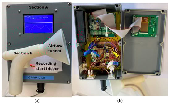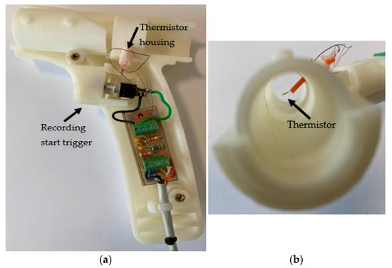 The sections of CPRM are shown in Figure 3a, and the base unit has been opened as depicted in the image to show its electronic circuitry in Figure 3b. Figure 4a shows the inner parts of the 3D-printed transducer section with the funnel removed, and Figure 4b shows the location of the thermistor. The transducer section was made using a standard 3D printer with the material ABS (Acrylonitrile Butadiene Styrene plastic). The melting range of ABS is about 190–270 °C, and it is generally accepted that it can safely be used without distorting up to 100 °C.