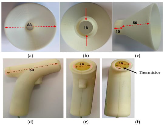 The transducer section with its funnel removed and related dimensions shown in millimeters. (a) The funnel air inlet side. (b) The funnel reverse end, the solid red line indicates diameter. (c) The funnel side view. (d) Side view of the transducer section with the funnel removed. (e) Front view of the transducer section with the funnel removed. (f) Reverse view of the transducer section with the funnel removed.