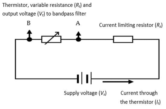 A negative temperature coefficient (NTC) thermistor, which is a semiconductor-type device whose resistance reduces with temperature increase, was used in the device’s design. The thermistor was a self-heating type, where the cooling of the thermistor was a function of the respiratory airflow velocity. The resistance variations were converted to an electrical signal representing respiratory airflow. Compared to typical anemometry applications, the current application required much higher sensitivity and shorter response time. The absolute values of the respiratory airflow velocity were not needed for this design, since the device only required the variations (i.e., rate of change) in the respiratory airflow velocity to determine the value of RR. A potential divider circuit (shown in Figure 6) was used to generate an output voltage signal for the thermistor. The series resistor (Rs) limited the current (It) to the thermistor—represented by its variable resistance as Rt. The signal from the thermistor (Vt) was subsequently band-pass filtered and amplified (explained in following sections). The processes of determining the values Rs and Rt are explained in the next sections.