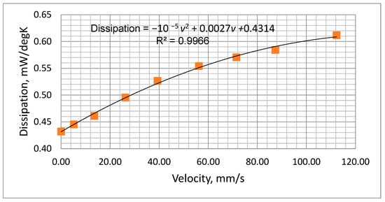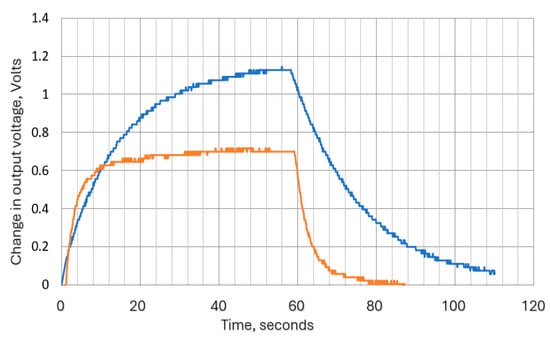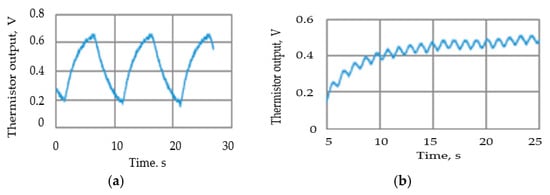 The thermistor time constant defines the speed at which the thermistor resistance changes when experiencing a change in the surrounding temperature. This is analogous to the time constant of an electrical resistor (R)–capacitor (C) filter. For liquids, this is quoted in data sheets as less than 1 s for the Betacurve device, and for the Micro-Beta device, it is 0.2 s. However, we did not find the required data for air, so tests were carried out to determine its approximate value. To carry out these tests, the supply voltage was applied to the circuit shown in Figure 6, and when stable conditions were reached, a flow of 60 mm/s was switched on (via an electromagnetic valve) for 1 min and then off again, with continuous monitoring of thermistor voltage and current. The thermistor voltage variation with time was exponential, as shown in Figure 7. This was as expected, since the system is analogous to an RC network. The attenuation factor in terms of time constant (τ) is interpreted in Table 2.