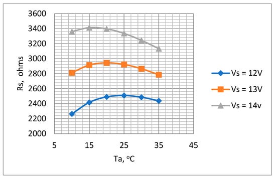 where Ro is the thermistor resistance at temperature To, β is the thermistor constant [], and Rs is the series resistance shown in Figure 6. From this equation, the temperature coefficient () of resistance at temperature T for a thermistor is
