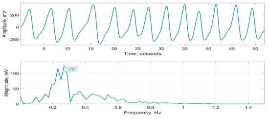 - Electrocardiogram (ECG)-derived RR (EDR): In this approach, the RR is determined from an ECG signal. The method is noninvasive and can be performed in both time and frequency domains. The movement of the chest due to respiration causes the distance between the electrodes used to measure the ECG to vary. This results in dynamic variations in the Q, R, and S features of the ECG [] from which the RR is determined. A few approaches were reported to determine the RR using the EDR []. In the frequency domain, the ECG is band-pass filtered, and its magnitude frequency spectrum is determined by using the discrete Fourier transform (DFT). The frequency associated with the highest peak in the magnitude frequency spectrum is used to determine the RR []. The positive aspect of these methods is that an available ECG machine could be utilized for this purpose (new equipment would not be required). However, EDR methods have limitations [], e.g., signal distortion due to any body movements and its computational complexities.