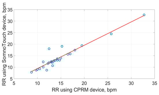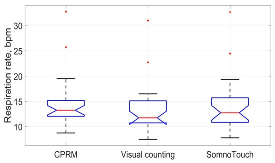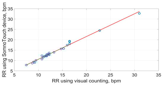 - Evaluation of the performance of the new RR measurement device against RR measures obtained by chest movement visual counting and by using a commercial respiratory measurement device called SOMNOtouch™ RESP [].