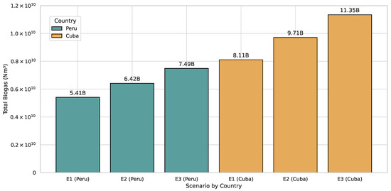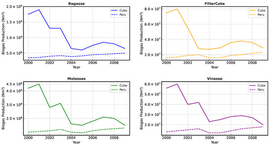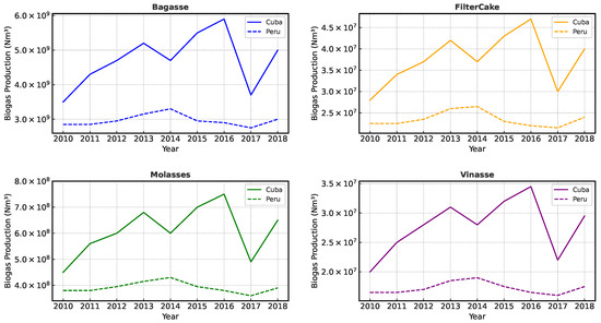 Studies such as those of Alfonso-Cardero et al. [15] in Cuba and Parsaee et al. [16] evidence its economic and energetic feasibility. As for filter cake, its nutritional richness has allowed it to be used as a stabilizing co-substrate, increasing biogas production by up to 30% [17,18]. In addition, emerging technologies such as two-phase digesters, structured bed systems or use of biochar have shown substantial improvements in efficiency; for example, Widyastuti et al. [19] increased production by 42% with Electro-Fenton pre-treatment, while Ma et al. [20] used Fe3O4 Nanoparticles and biochar as a direct electron transfer (DIET) conductor. Finally, several authors have addressed techno-economic simulations and predictive models integrating waste co-utilization: Masala et al. [21] and Srinivas et al. [22] estimated energy self-sufficiency of 73% combining vinasse biogas and bagasse cogeneration, while Tian et al. [23] calculated net emissions of 0.21 kg -eq/kWh under centralized biogas schemes. Despite these advances, a major gap persists: the lack of validated predictive models that estimate multiresidue energy potential from actual milling data and generated by-products. This study addresses this gap through an empirically validated model that allows for estimating the biogas potential per ton of sugarcane processed, comparing two contrasting national scenarios such as Peru and Cuba, and offering a practical tool for energy planning in the framework of the circular bioeconomy.